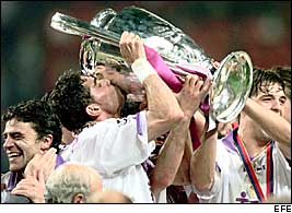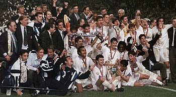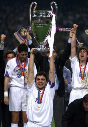 Manolo Sanchis levanta la copa que acredit al Madrid como Campeon de Europa 97-98.