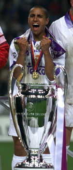 Roberto Carlos sonrie feliz detras de la copa.